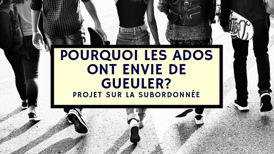 Une fois l’exercice corrigé, je leur ai demandé de se placer en équipe de deux personnes afin qu’ils trouvent une phrase (dans laquelle se retrouverait une subordonnée) répondant à la question « Pourquoi les ados ont envie de gueuler? » à la manière de l’album de Lucile de Pesloüan et Geneviève Darling pour finalement, le cours suivant, créer une affiche sur Canva avec leur phrase.