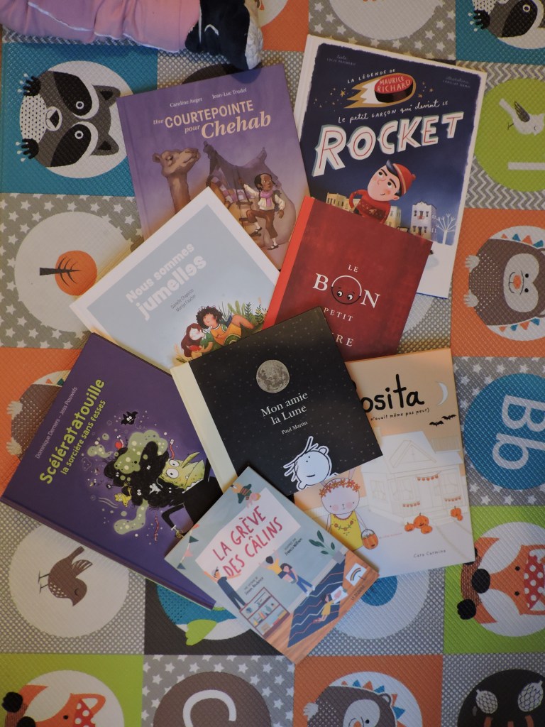 Nous avons tout de même pris le temps de lire des albums d’Halloween, dont quelques-uns que nous avions déjà lus. Nous avons trippé sur Scélératatouille la sorcière sans fesses. Je dis nous, parce qu’avec les intonations que je m’amusais à faire, j’avais toute son attention! Même papa a trouvé l’histoire chouette! Il a aussi adoré Le petit garçon qui devint le Rocket. Quant à moi, outre mon coup de coeur pour Scélératatouille, j’ai été touchée par Une courtepointe pour Chehab, un magnifique album que j’ai intégré à mon travail sur l’immigration, et La grève des câlins, une histoire de Simon Boulerice sur la distanciation causée par la situation actuelle.