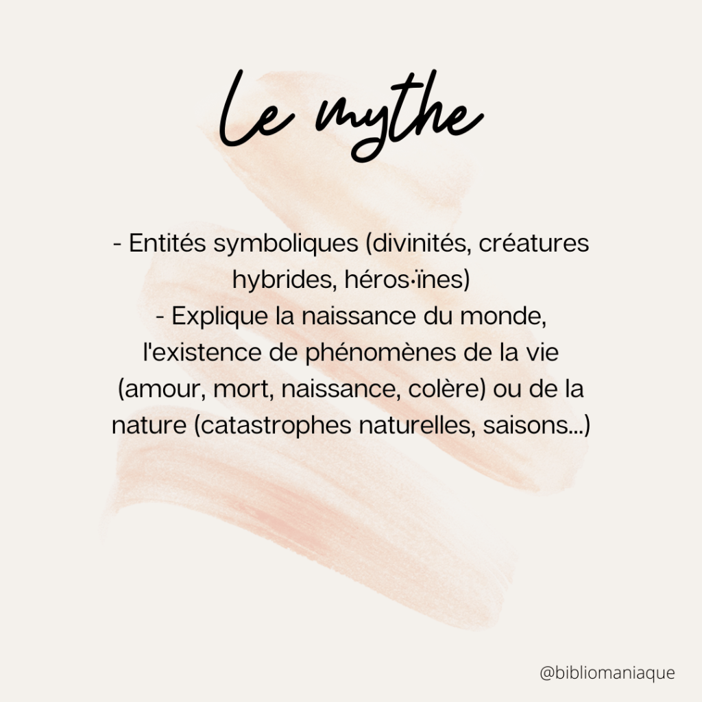 On y retrouve également des entités symboliques comme des divinités, des héros‧ïnes et des créatures hybrides (les créatures thérianthropiques, la gorgone, la licorne, Pégase…). Chaque mythe est alors très représentatif des croyances du peuple auquel il appartient.