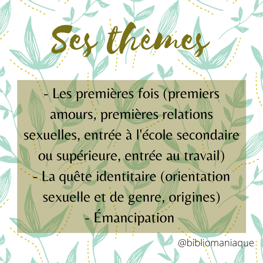 Certaines thématiques populaires propres à l’adolescence filent à travers les livres pour jeunes adultes. C’est le cas des premières fois (premiers amours, premières relations sexuelles, entrée à l’école secondaire, entrée au travail…), de la quête identitaire (origines, orientation sexuelle, orientation de genre…) ou de l’émancipation. Si on veut faire une distinction plus grande encore, on classera les œuvres dont les thématiques principales concernent les premières fois (entrée sur le marché du travail, études supérieures, première relation amoureuse…) et la sexualité comme étant des livres New Adult.