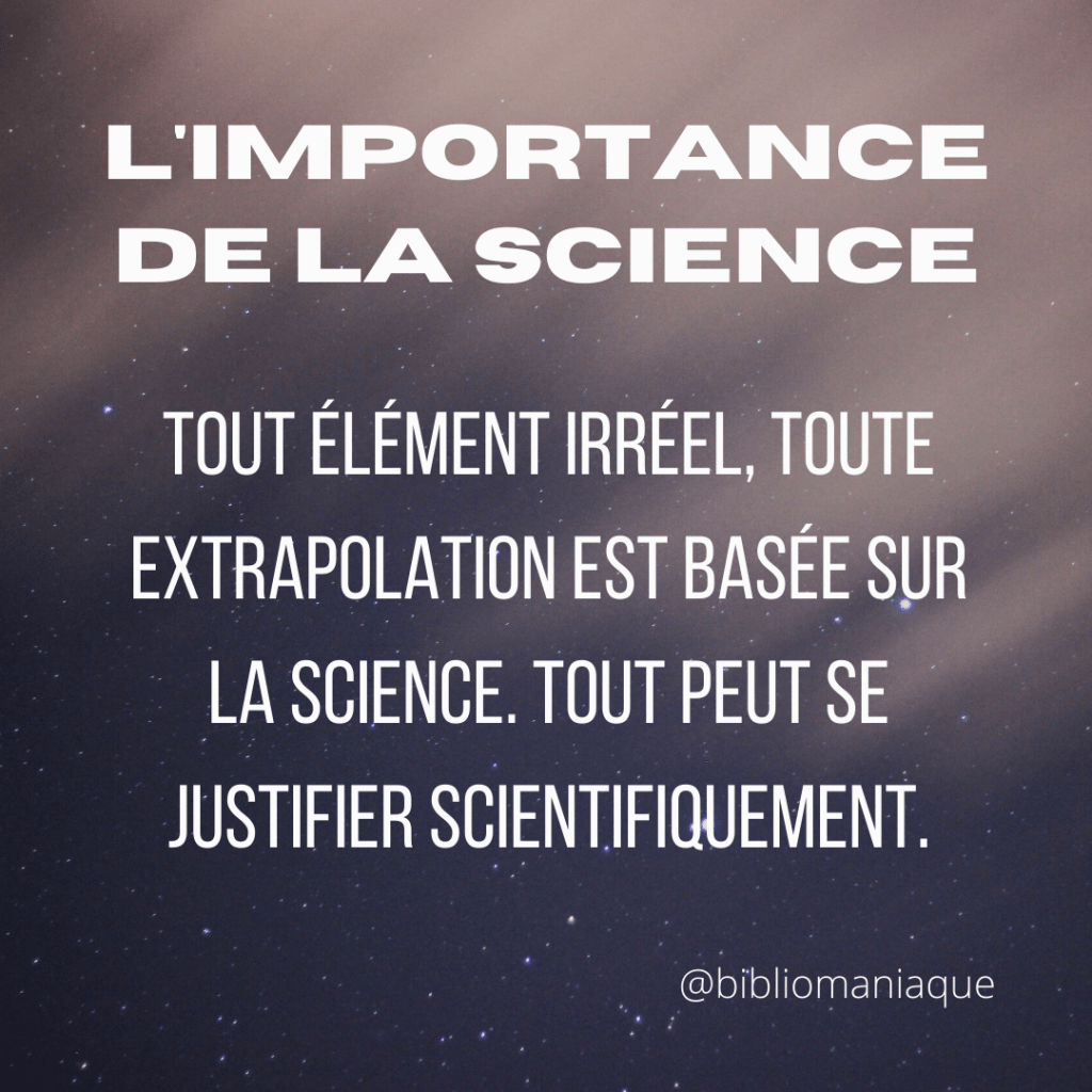 L’élément principal qui distingue la SF des autres littératures de l’imaginaire (fantastique, merveilleux, fantasy, dystopie…) est son lien avec la science. En effet, toute extrapolation, tout élément irrationnel ou irréel est basé sur la science. Certes, on invente un monde, des personnages qui ne sont pas humains, des machines, mais toutes ces inventions se justifient scientifiquement.