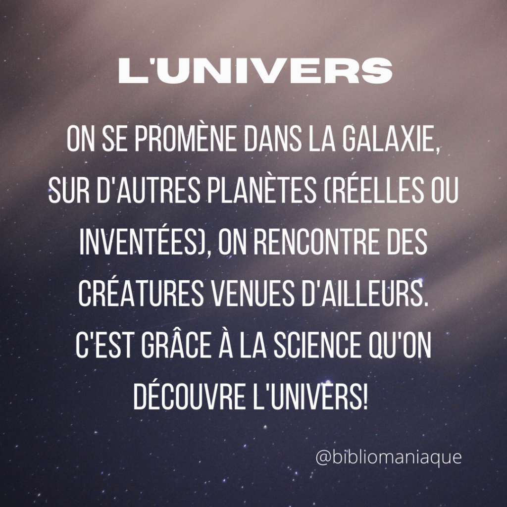 Certains romans de SF se déroulent dans la galaxie, sur une autre planète, ou font tout simplement intervenir des créatures qui viennent d’une autre planète. Le lien avec les sciences? C’est grâce à son avancée qu’on peut découvrir ce qui se passe plus loin dans l’univers! Si on veut préciser les genres, on nommera planet-opera l’histoire qui se déroule sur une autre planète et space-opera celle qui se déroule dans l’univers tout entier.