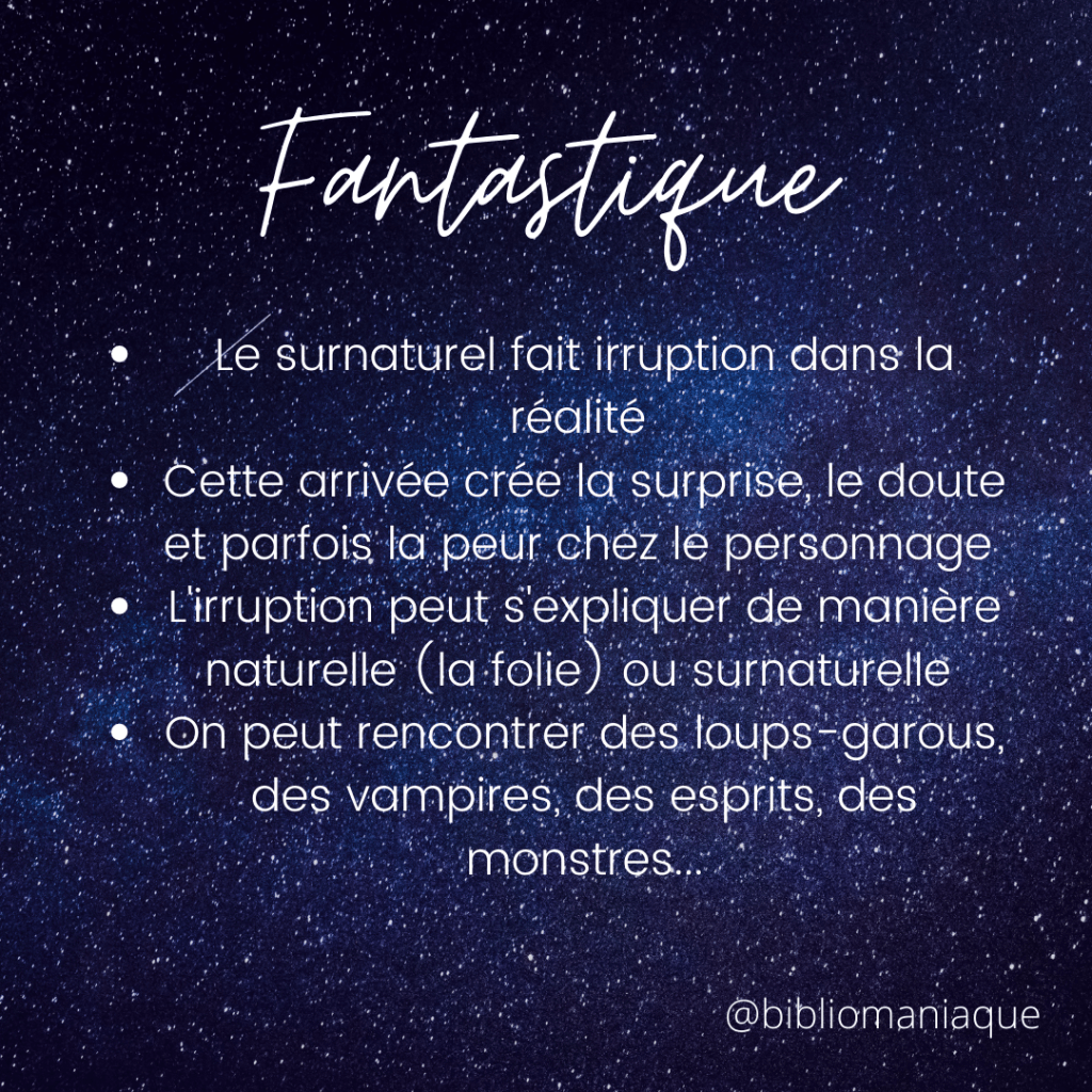 Dans le récit fantastique, le surnaturel fait irruption dans un monde totalement réaliste. Le personnage sera lui-même surpris par cette arrivée brutale, par cette rencontre à laquelle il ne sait pas s’il doit croire. On y rencontre donc des personnages comme des vampires, des loups-garous, des monstres, des fantômes. L’évènement étrange qui se produit pourrait s’expliquer de manière surnaturelle ou de manière naturelle (la folie). C’est ce balancement entre les deux qui caractérise le récit fantastique.