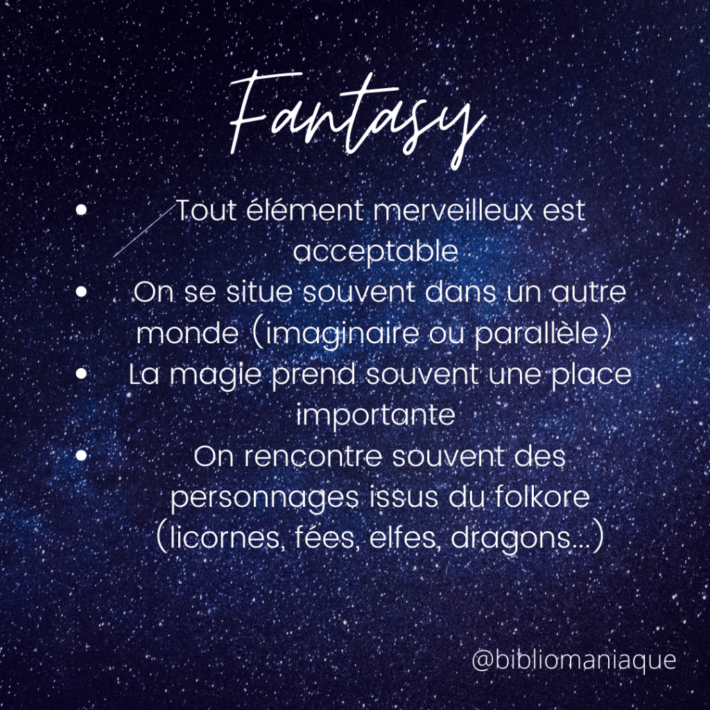 Dans la fantasy, tout est acceptable, notamment parce qu’on nous situe, en général, déjà dans un monde imaginaire ou parallèle. Bien qu’on accepte la présence d’éléments surnaturels dans la fantasy, il n’est pas rare de voir le protagoniste s’en étonner, sans toutefois que cela ne crée de la peur ou de l’incompréhension comme dans le fantastique. Très souvent, la magie prend une place imposante dans la fantasy. Elle est au genre ce que la science est à la science-fiction! On y retrouve aussi beaucoup de personnages issus du folklore (licornes, magiciens, fées, elfes, dragons…).
