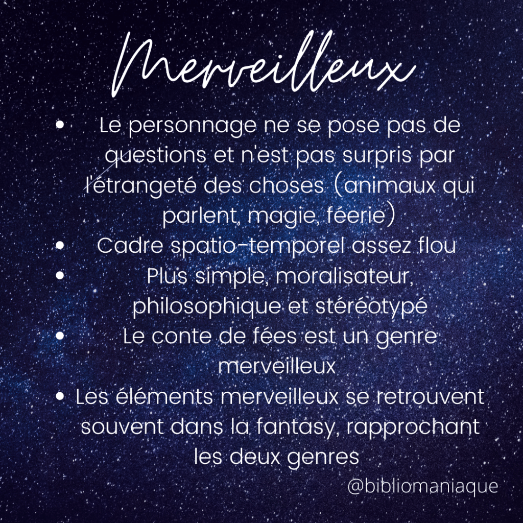 Genre le plus ancien, le merveilleux rappelle souvent les contes de fées. C’est un genre dans lequel tout ce qui nous semblerait anormal est accepté, sans que le personnage ne se pose de questions. On pense ici aux animaux qui parlent, aux créatures féériques, à la magie… Le cadre spatio-temporel est aussi assez flou : on n’a qu’à penser à la traditionnelle formule d’ouverture des contes Il était une fois, dans un pays lointain. Il faut aussi garder en tête qu’on trouve beaucoup d’éléments merveilleux dans la fantasy, rapprochant alors les deux genres. Cela dit, le merveilleux se veut plus simple, stéréotypé et moralisateur/philosophique vu son omniprésence dans les contes traditionnels.