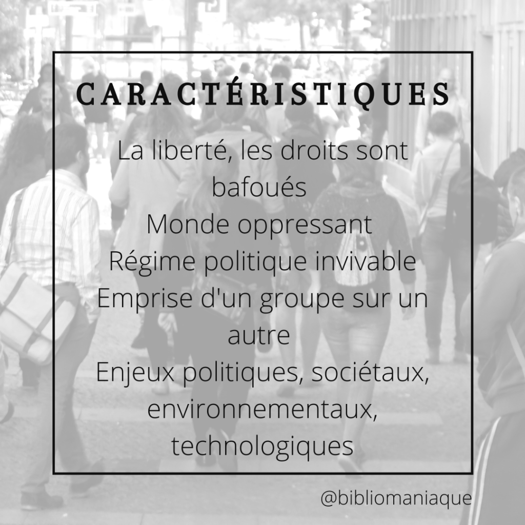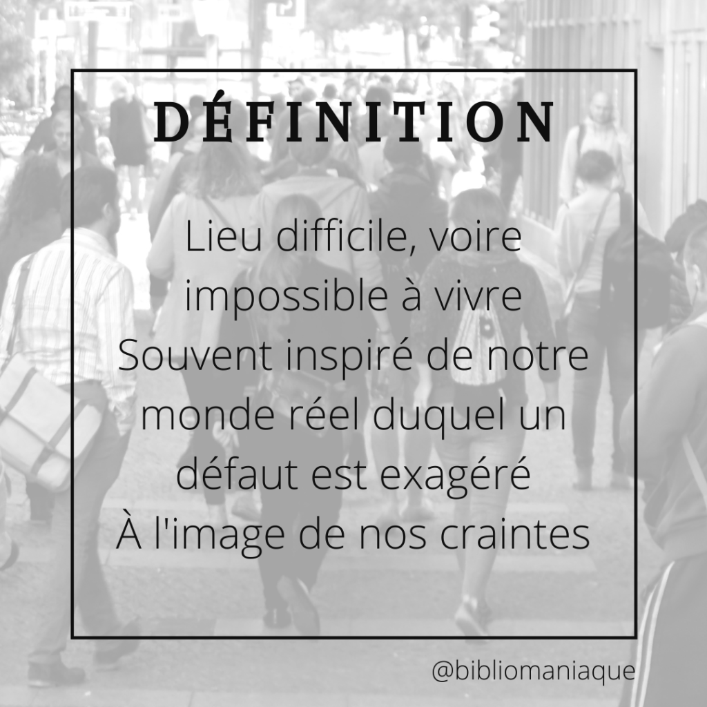 Brièvement, la dystopie est un lieu difficile. Un lieu où on ne veut pas vivre, où nos droits, nos libertés, notre bonheur sont bafoués, voire inexistants. Le roman (ou la BD, l’album, la nouvelle, le film…) dystopique se déroulera alors dans un lieu inexistant, souvent inspiré de notre monde actuel duquel on exagère un défaut, rendant ainsi le monde impossible à vivre.