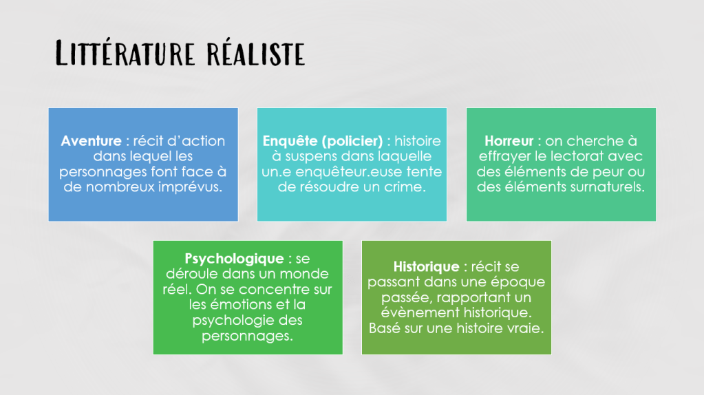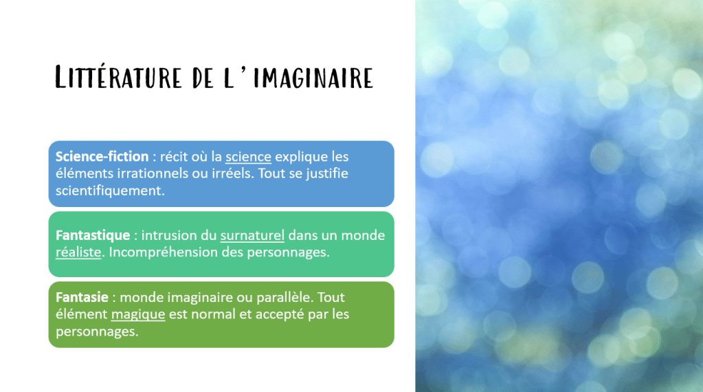 En présentant les livres, cette année, j’ai aussi pris le temps de présenter les genres avec un diaporama. J’ai séparé le tout en deux catégories (comme ce l’est dans ma bibliothèque) : littératures de l’imaginaire et littératures réalistes. Je leur ai donc présenté les genres qu’on retrouve dans ma bibliothèque : science-fiction, fantastique, fantasie, psychologique, enquête, aventure, horreur et historique.