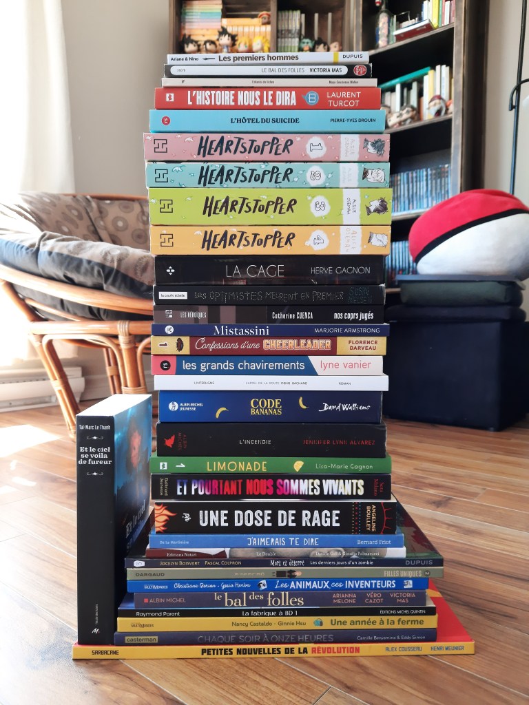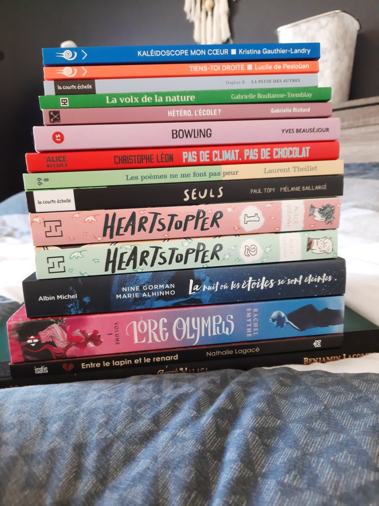 Avec ma virée magasinage, il n’est pas surprenant de voir la hauteur de ma pile d’ajouts. Il faut dire aussi que j’ai craqué après le premier tome de Heartstopper et que je me suis vite procuré les trois autres! Voici donc tous les livres qui s’ajoutent à ma pàl.