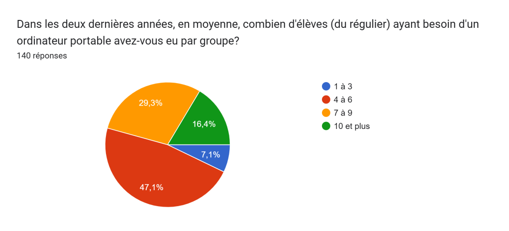 Ce sont 154 personnes enseignantes de français du réseau public au Québec qui ont répondu au sondage que j’ai lancé sur les groupes d’enseignement du français. Les questions concernaient les deux dernières années d’enseignement afin de refléter un portrait le plus actuel possible.