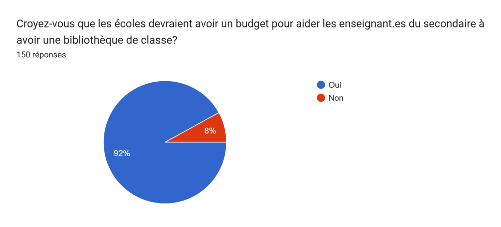 La donnée la plus marquante concerne la façon de se procurer les livres. Oui, 88,9 % des personnes répondantes affirment avoir une bibliothèque de classe, mais sur ces 115 personnes, 102 disent que la majorité des livres de leur bibliothèque sont achetés avec leur argent personnel puisqu’au secondaire, c’est une minorité (21 %) qui a un budget de classe, contrairement au primaire. C’est un investissement considérable quand on sait que ces livres peuvent être égarés et brisés (c’est ici mon expérience personnelle qui l’affirme!).